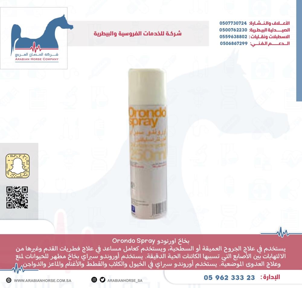 يستخدم في علاج الجروح العميقة أو السطحية، ويستخدم كعامل مساعد في علاج فطريات القدم وغيرها من الالتهابات بين الأصابع التي تسببها الكائنات الحية الدقيقة. يستخدم أوروندو سبراي بخاخ مطهر للحيوانات لمنع وعلاج العدوى الموضعية. يستخدم أوروندو سبراي في الخيول والكلاب والقطط والأغنام والماعز والدواجن.