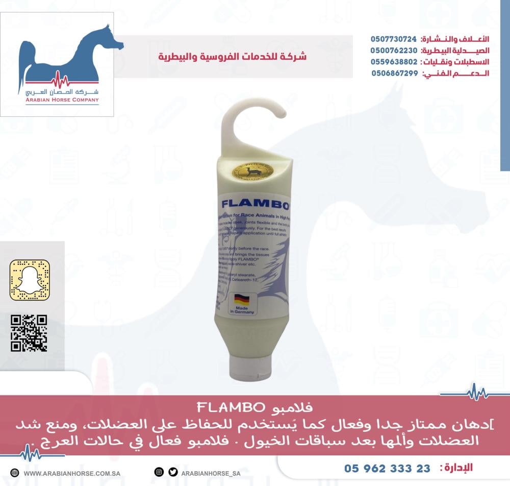 ]دهان ممتاز جدا وفعال كما يُستخدم للحفاظ على العضلات، ومنع شد العضلات وألمها بعد سباقات الخيول · فلامبو فعال في حالات العرج .